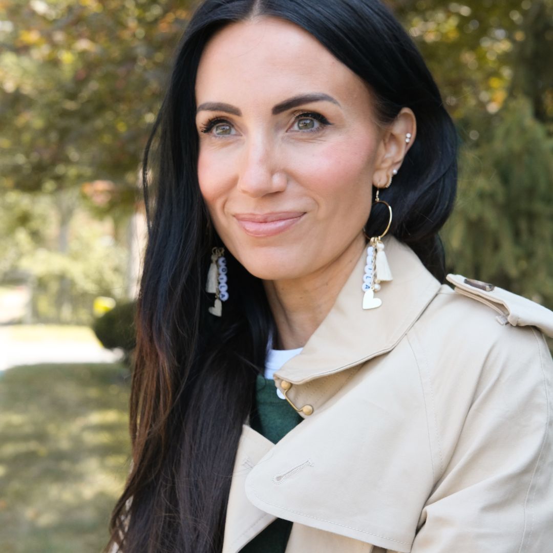 The free-spirited Voila Esti is an artful earring crafted with gold hoops, a mix of metal, leather, and stone with added charm elements. A strand of beads spelling "Voila" takes center stage with a beautiful enamel heart charm and cotton tassel.