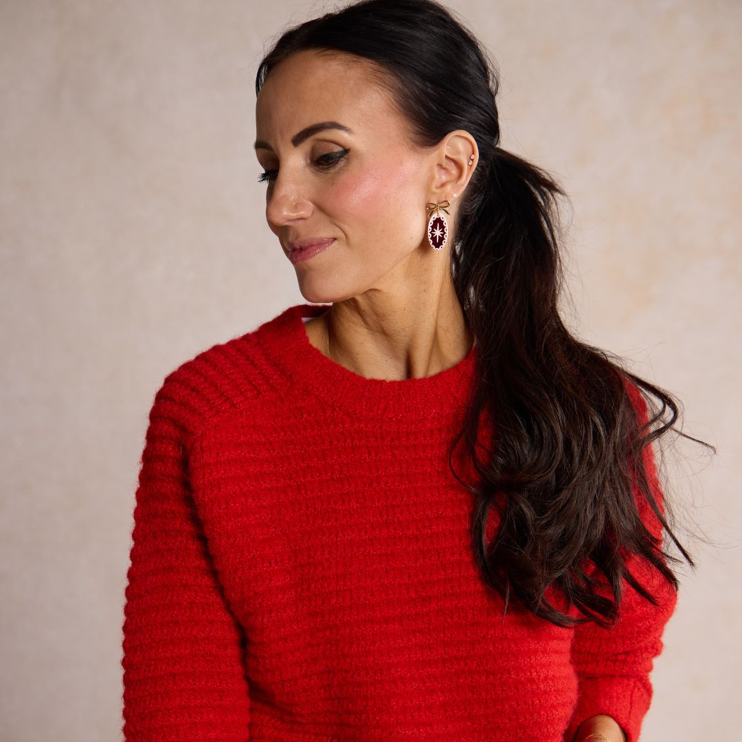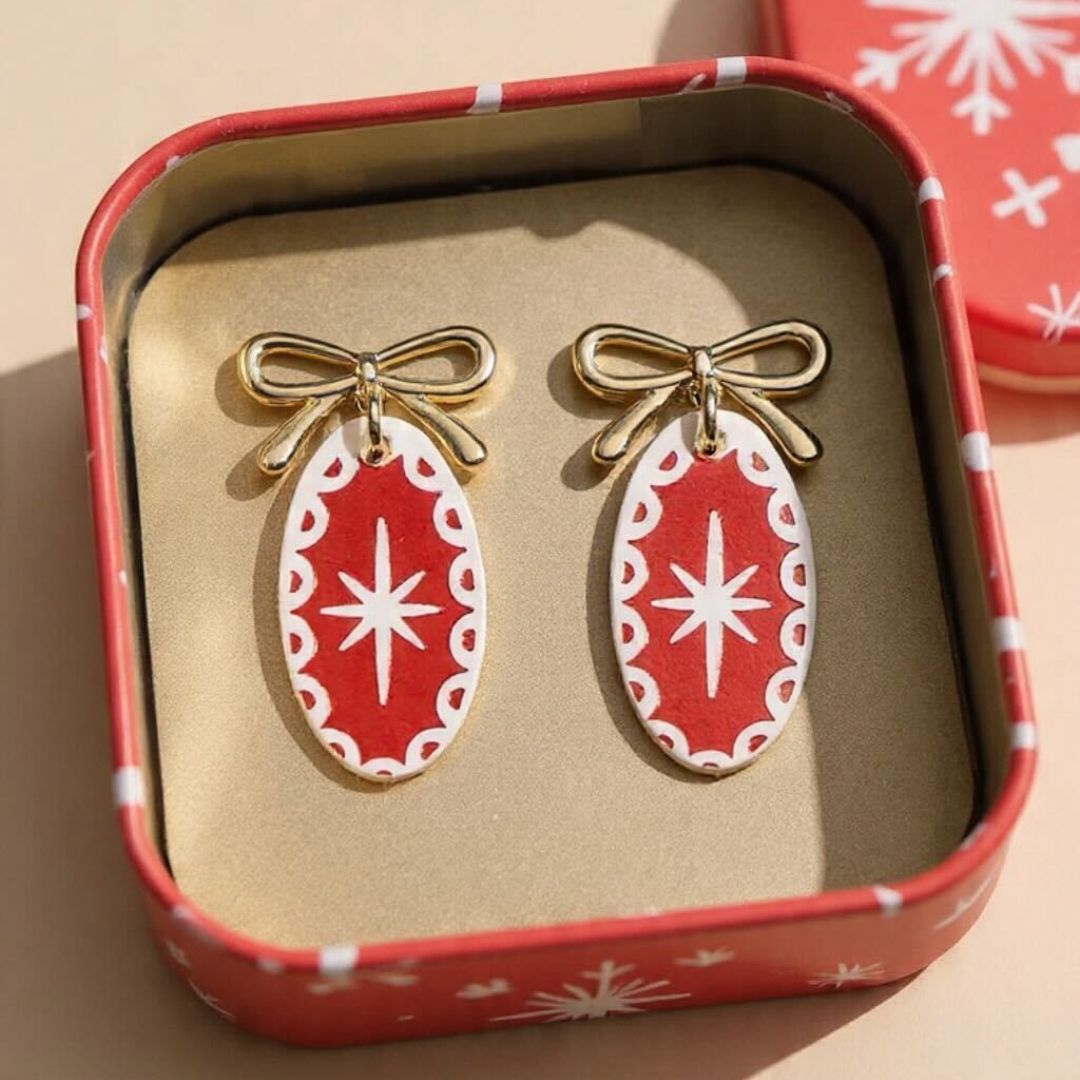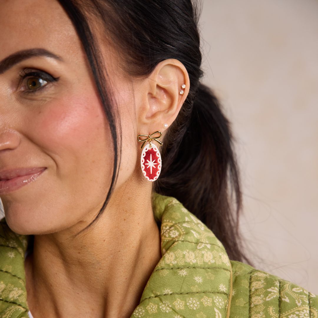 An elevated holiday statement, meet the White Ingrid. A drop earring featuring vibrant red gloss foil and finished with a chic gold bow stud.